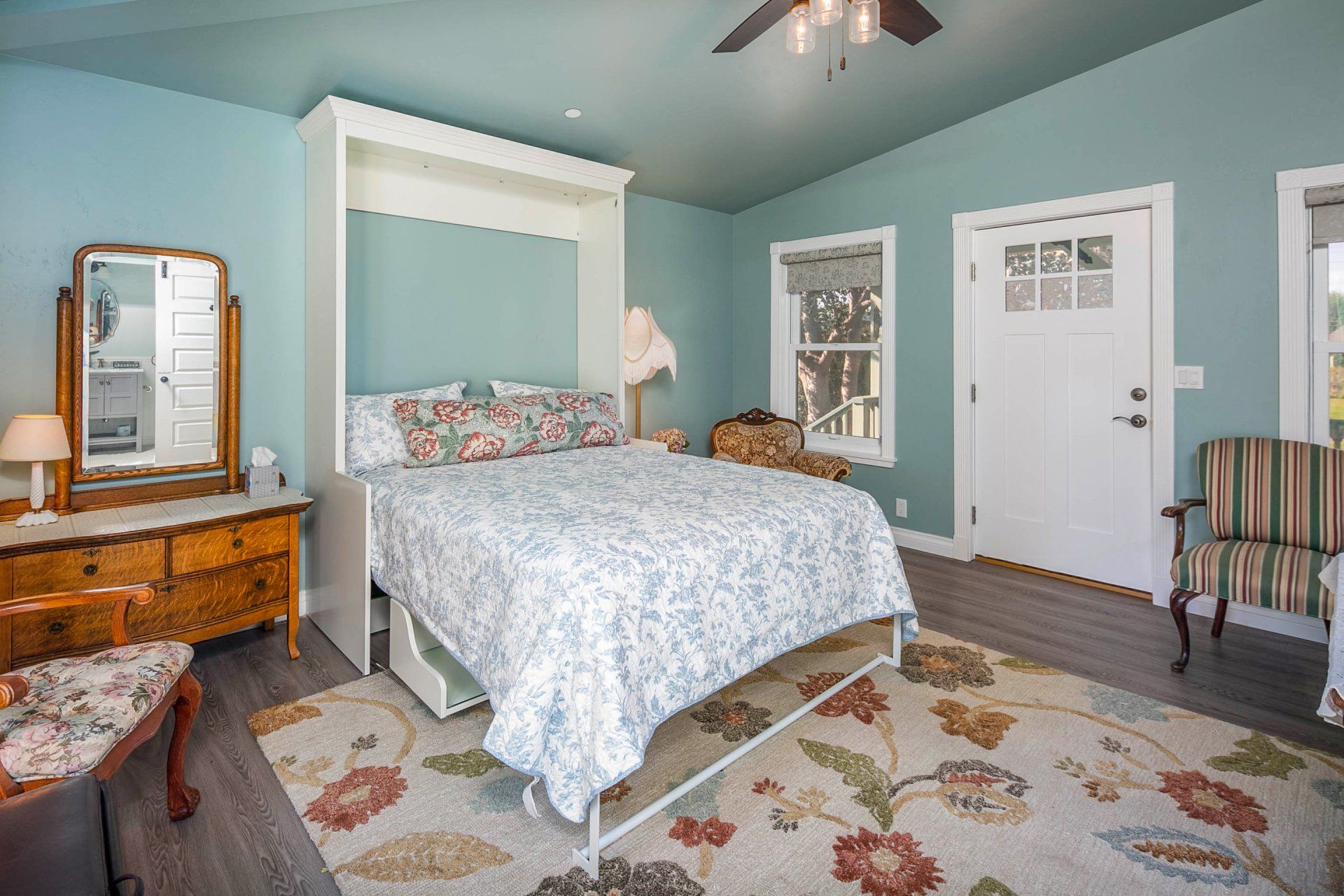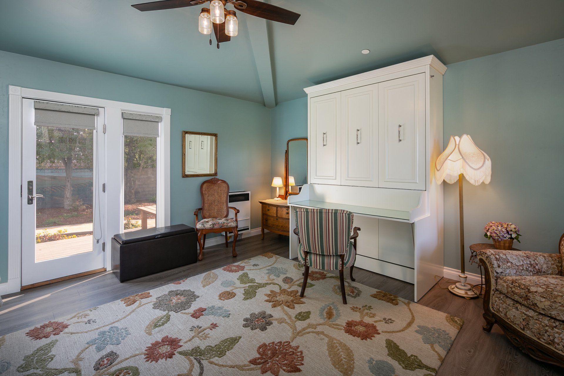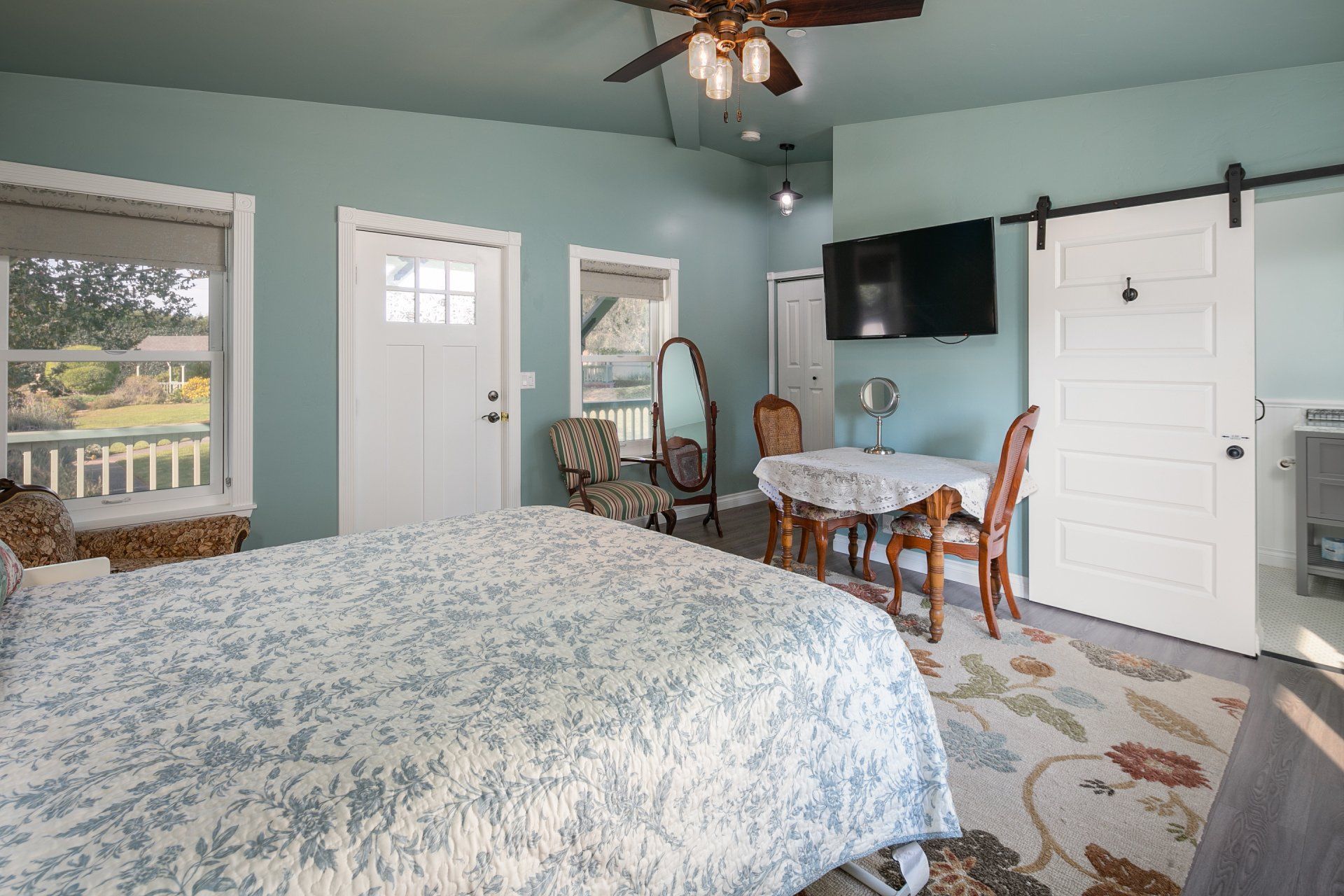 Enjoy a very comfortable, private space with Victorian details. A shared front porch and a private deck allow you to enjoy the outdoors in our uniquely mild climate. Our comfortable queen size wall bed converts to a desk during the day. We provide free DirecTV. Our saloon style building is all new with a contemporary glass shower in a spacious bath. All of this located on a large Victorian Estate. Enjoy a peaceful stay in a completely private space.