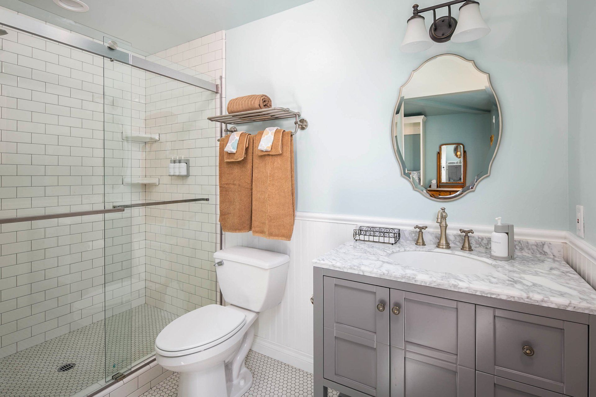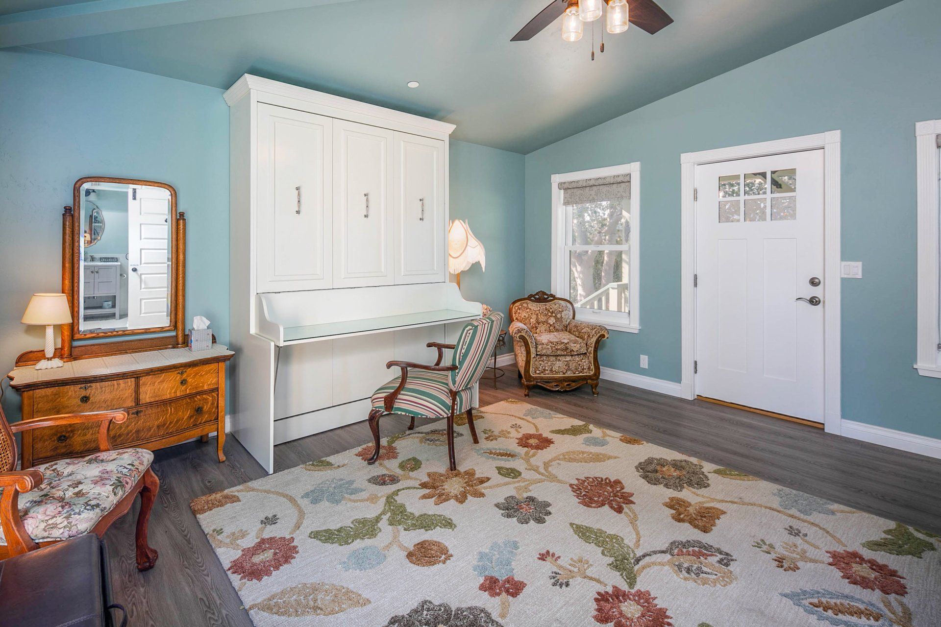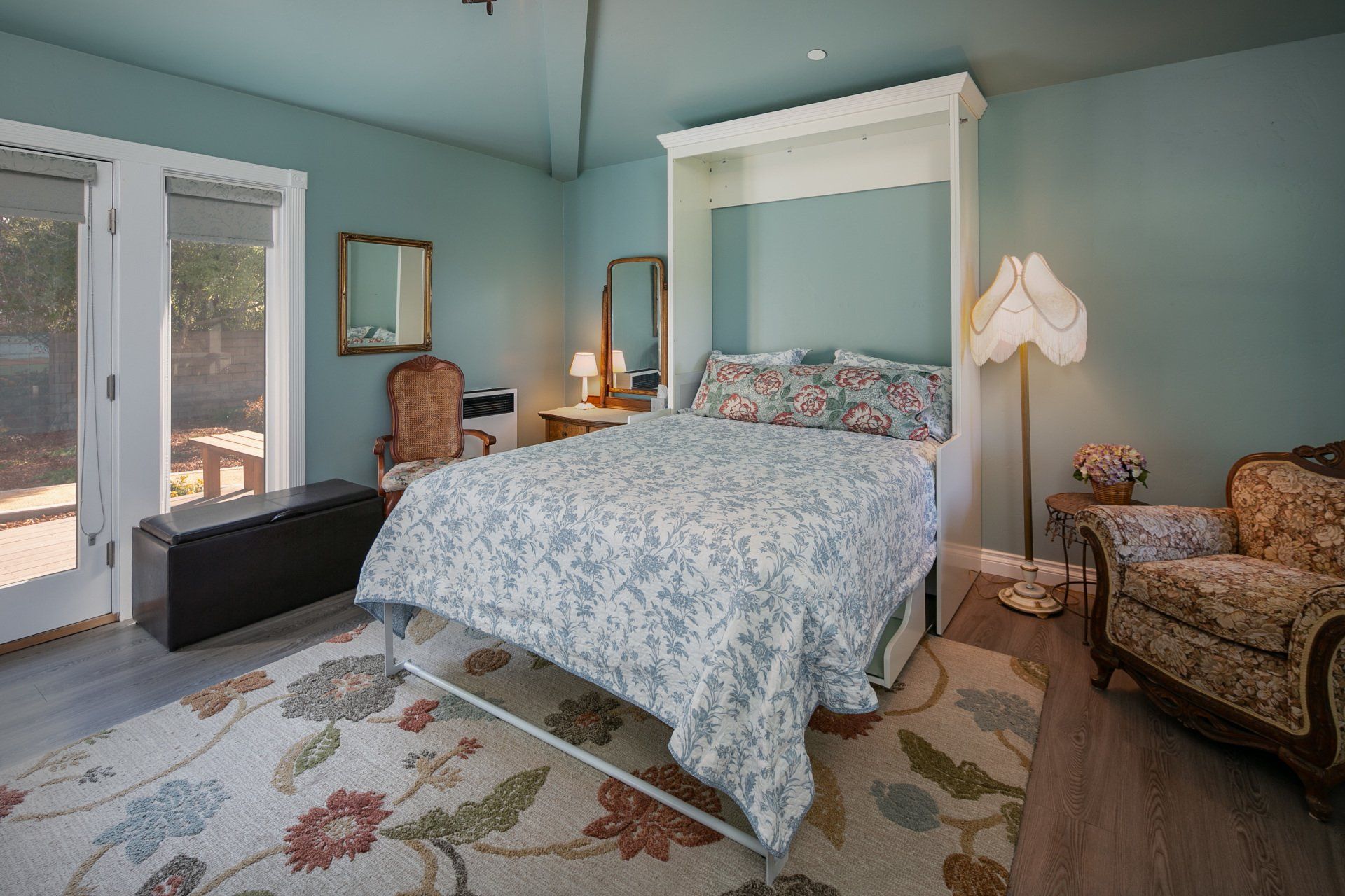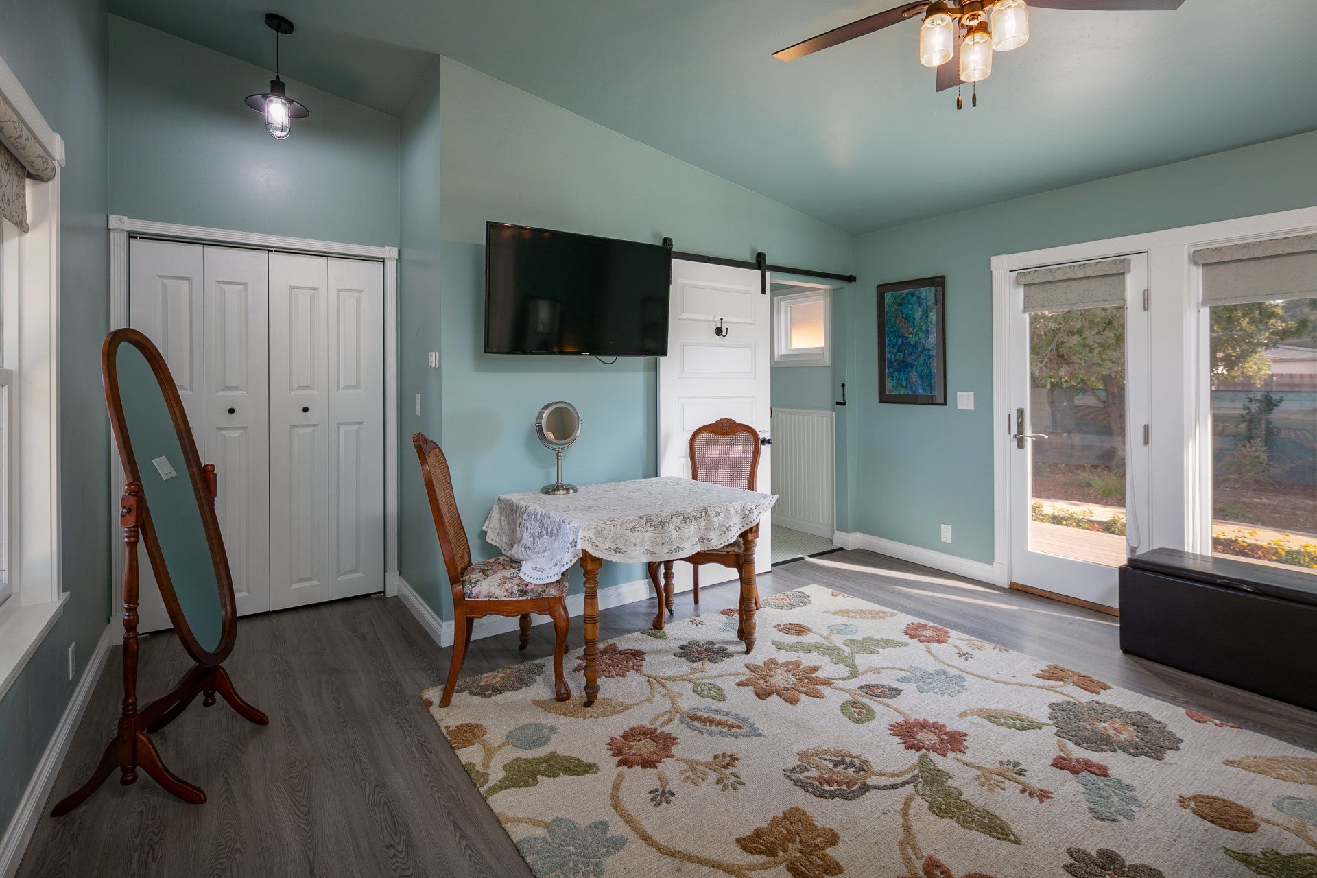 Enjoy a very comfortable, private space with Victorian details. A shared front porch and a private deck allow you to enjoy the outdoors in our uniquely mild climate. Our comfortable queen size wall bed converts to a desk during the day. We provide free DirecTV. Our saloon style building is all new with a contemporary glass shower in a spacious bath. All of this located on a large Victorian Estate. Enjoy a peaceful stay in a completely private space.