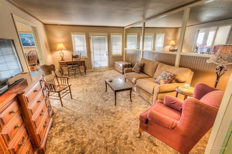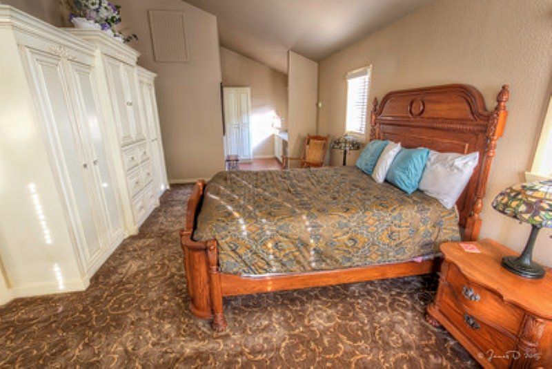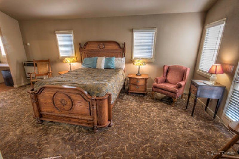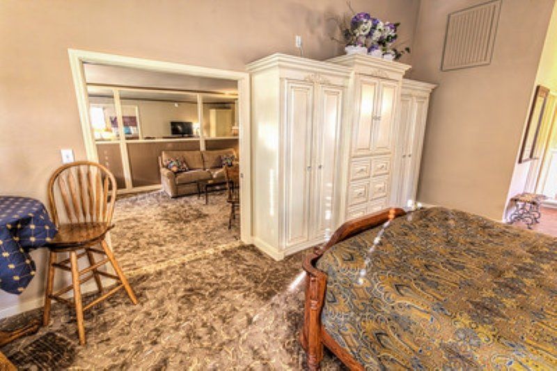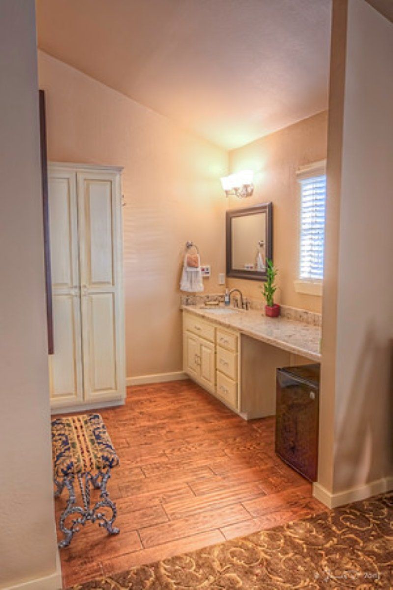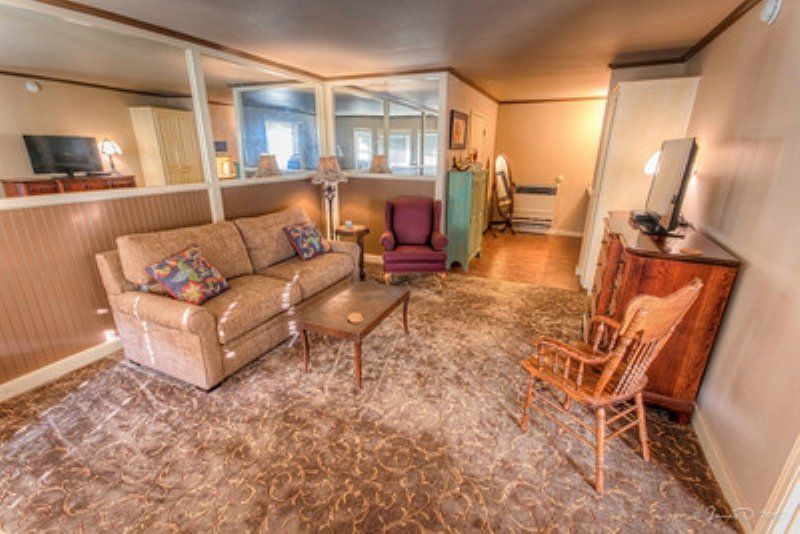 This 2 room suite with 2 full baths & 2 flat screen TVs has a living area with a very comfortable queen sofa bed next to a private bedroom with Victorian style queen size bed. The vanity/kitchen area has a mini fridge, microwave & toaster oven.